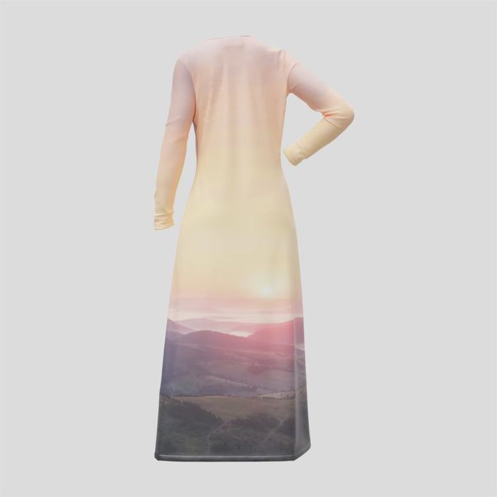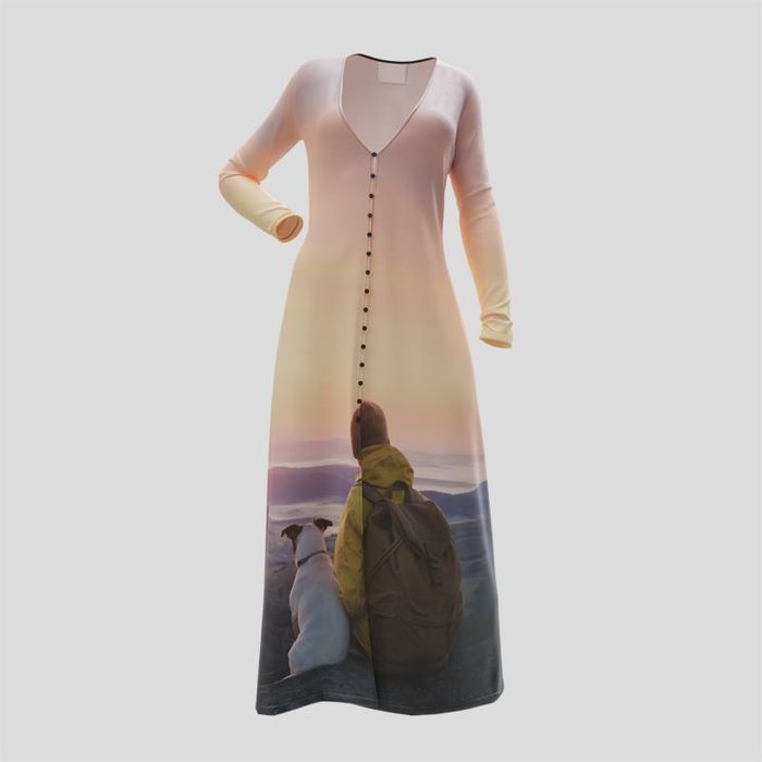 Slip into effortless style with a personalised bespoke button through dress that captures your personality. The stretch jersey hugs the body without feeling restrictive, while the long sleeves and V-neck create a streamlined silhouette. Opt for the knee length for laid-back days, or go for the midi version for extra coverage. Because every dress is printed and sewn to order, there is no excess stock – a planet-friendly way to refresh your wardrobe.