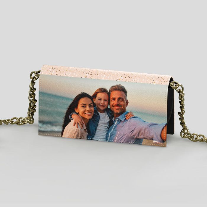 You can upload photos, images and text to make a truly unique gift. When designing your custom evening bags you have the option of a single image or split images for the exterior panel.