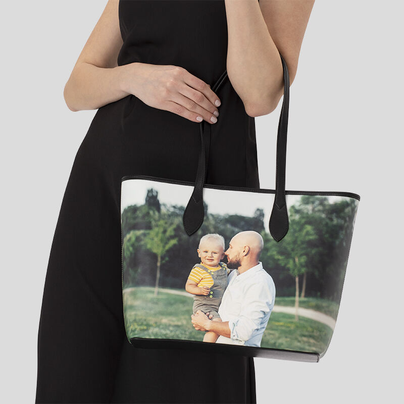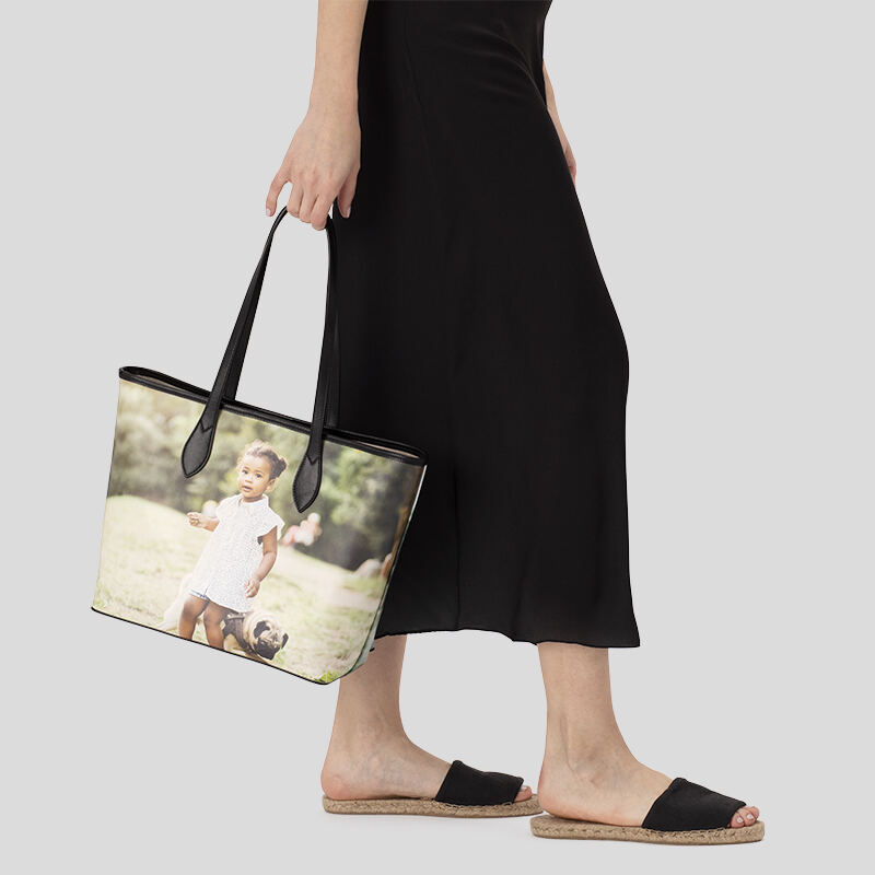 We recommend that you keep your images centralised as the design wraps around the sides. Therefore, you want the focus of your photos to fall in the centre, rather than the sides, so keep this in mind as you position your images on your personalised city tote. When selecting your images also keep in mind that certain areas of the bag, such as the handles and trim, will be made from black Nappa leather, so it is best to choose images and patterns that will complement these areas.