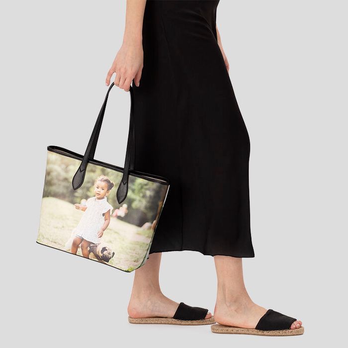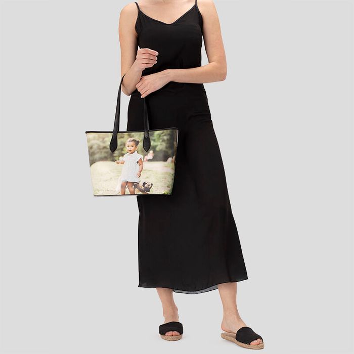Your personalised city tote is made from your choice of smooth or textured Nappa leather. The accents, such as the handles, base, closing straps, pocket details, and the leather trim around the bag are made using black, smooth Nappa leather. Measuring at 34cm W x 29cm H x 14cm D, you have the perfect amount of space to fit all your essentials when on the go. This size is ideal to use as a work bag or hand luggage as it is spacious, and you can easily reach in to grab your phone or passport without fiddly zips getting in the way. The straps of your custom leather city tote are 59cm, the perfect length to sling effortlessly onto your shoulder. Fully customise every inch of your bag by selecting from 3 hardware colours: gold, gunmetal, or nickel, and 3 thread colours: cream, grey, or charcoal, in order to compliment your chosen images. Design your own city tote bag for you and your mother to match. A bespoke photo gift that will make for a long-lasting wardrobe staple; nothing stays in style quite like leather goods.