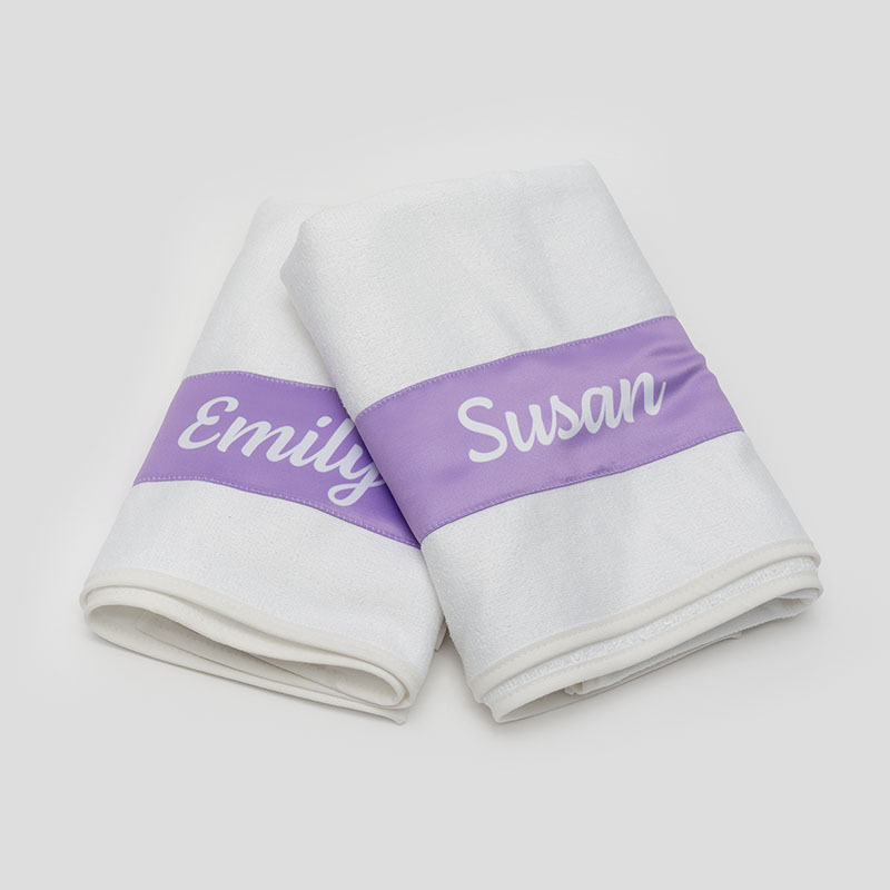 Your bespoke towels are all handmade to order. Your designs are printed onto the luxurious Duchess Satin strip, which is cut to size and hand stitched onto the microfibre towelling fabric. The specialist printing process locks in the colour so your design remains vibrant wash after wash. Your His and Hers towels are made by hand from start to finish, ensuring a truly authentic gift with an expert and personal touch.