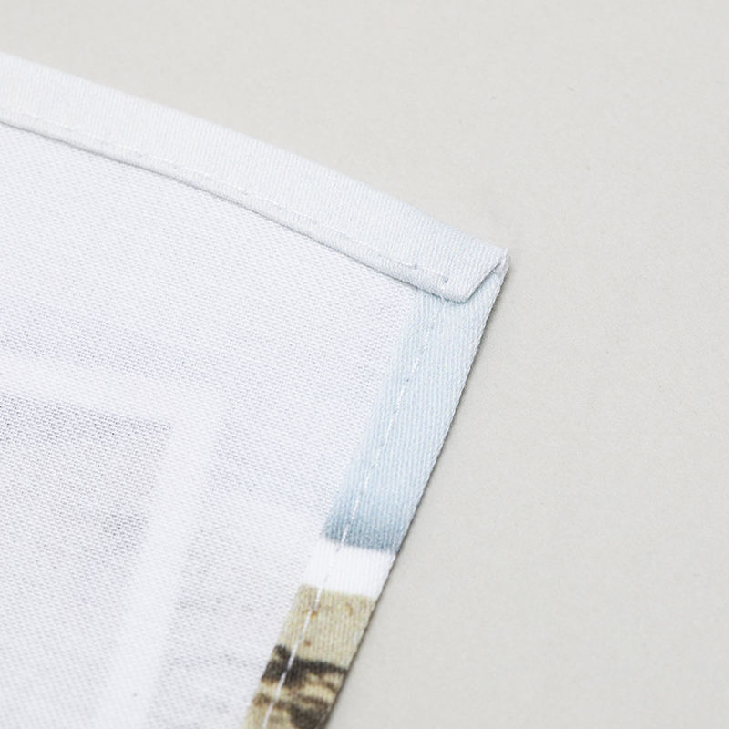 Handy Tip: When creating your design, allow a small bleed area as the hem is hand-sewn. Keep important details away from the edges for best results.