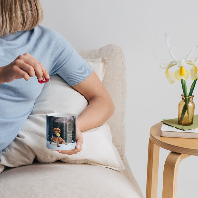 Your photos wrap around the body of the mug to create an elegant design, with only a small gap where the photos meet at the handle. Spacing at the top and bottom looks smart and stylish. If you’re choosing a small single photo, bear in mind it may not wrap around the entire mug, and we wouldn’t stretch your photo because this ruins the quality. Use the design preview to perfectly position your photo to avoid disappointment.
