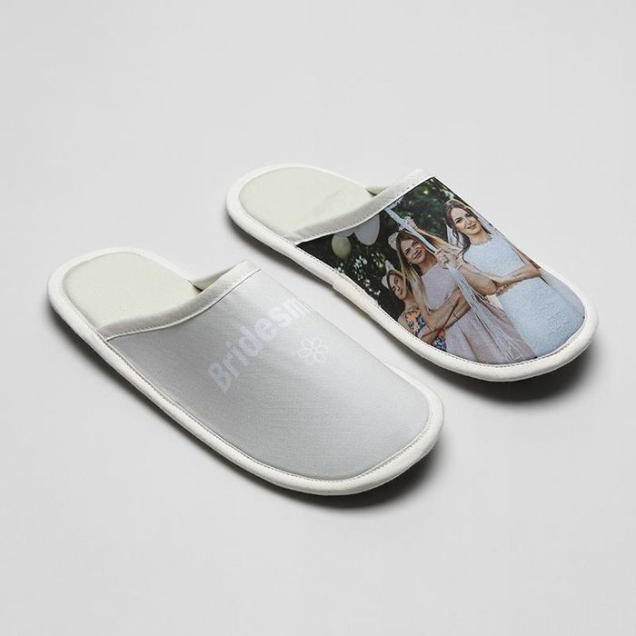 Design your own personalised bridal slippers for the bridal party on the big day itself. You can add photos and the role of each person on the vamp, such as 'bride', 'bridesmaid', 'flower girl' and you could even include in 'groomsman'. These are great for wearing during the hair and make-up part of the day, without risking scuffing up your wedding shoes. Or even for the end of the night once you've kicked off your shoes for more dancing. You could also add a personal message on the insole to thank them for participating in your special day.