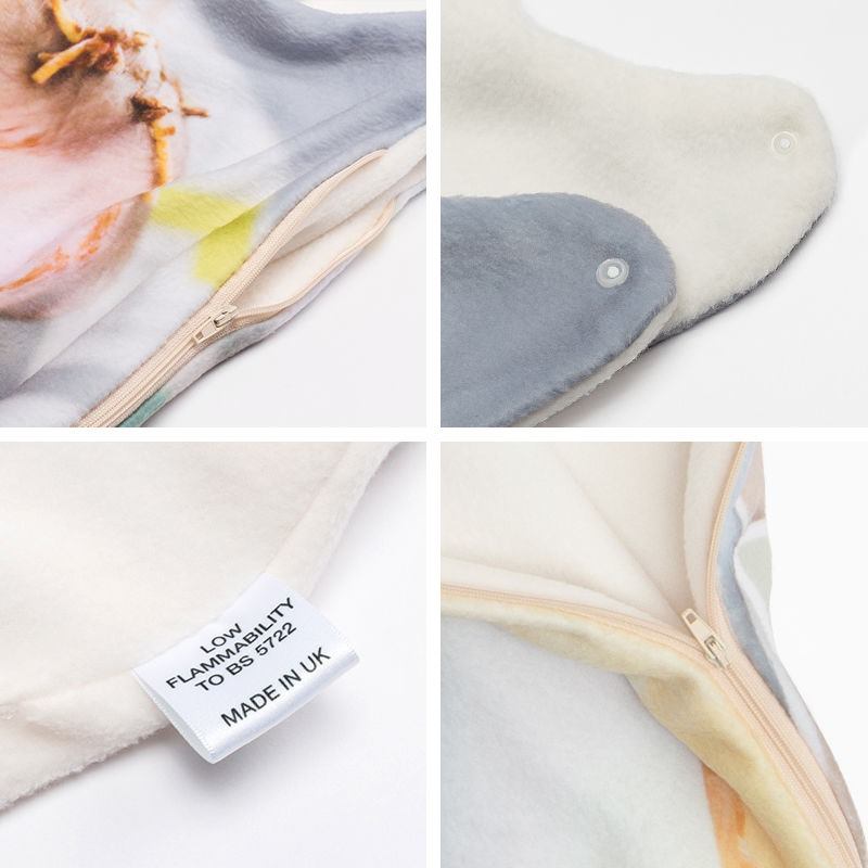 You get to personalise all over your personalised baby sleeping bag to create a gorgeous accessory and sentimental keepsake. The shoulder straps are also printed, however, due to the shape of the bag, it's best to keep any pictures of people's faces on the front tummy area. Within the design interface, you'll also notice that the shoulders have two precut out holes. This indicates where the poppers will go, so bear this in mind in case any important text or photo features get lost in the cutouts.