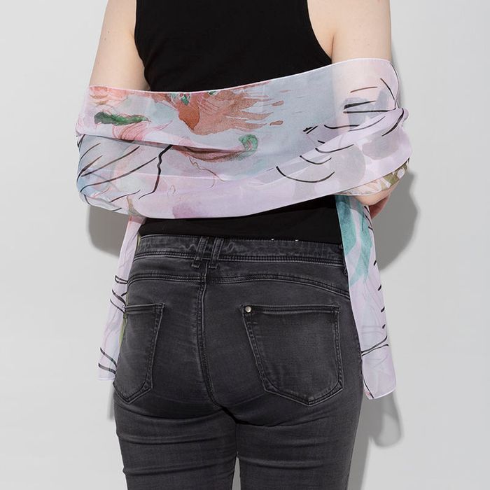 We print your ladies' chiffon personalised shawls in full colour, with glorious eco-friendly inks. Your chiffon personalised shawl will have your design on the face, and depending on the fabric that you have chosen, you should see some show-through to the reverse side. If chiffon is not the fabric for you, you can choose from a wide array of available fabrics. We have a choice of two natural materials, which offer an amazingly delicate and feminine drape, or three poly fabrics for easier care.