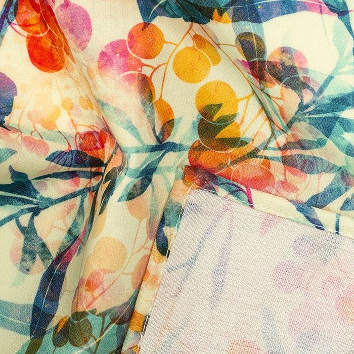 70% cotton 30% silk lightweight woven voile. Print shows through 90% to reverse. Super bright colours & deep blacks using reactive ink chemistry. Expect shrinkage of 1.25% weft, 3.75% warp.