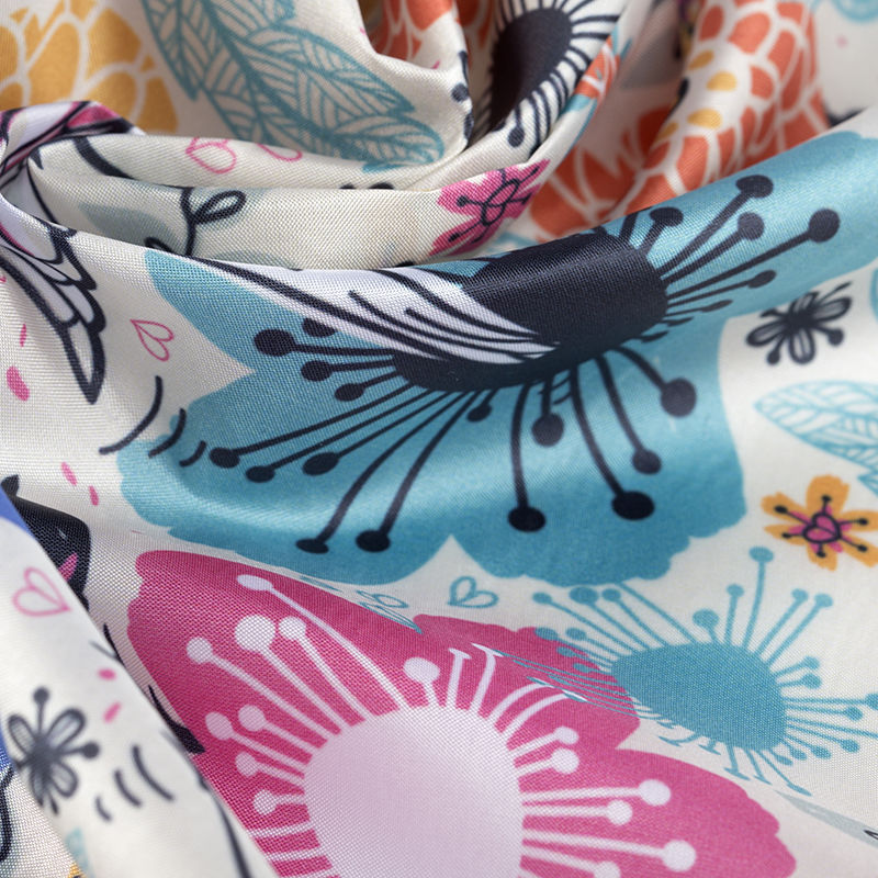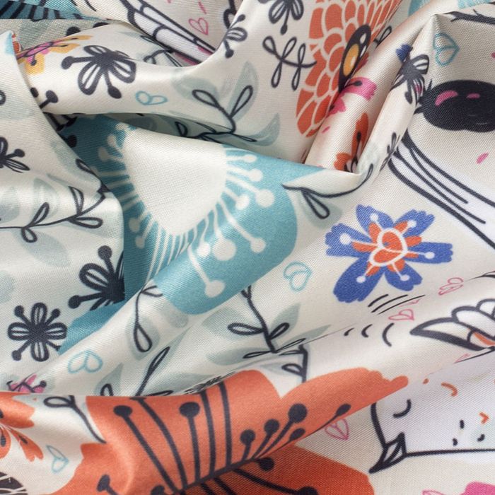 To guarantee a bold, everlasting print for your custom designed silk impression, we use dye sublimation. This process bonds the ink deep into the textile so it won't rub away or come off in the wash. This poly-blend material is woven in a tight plain weave, so fine details and lines come through crisp and clear. Perfect if you've got an intricate pattern. You can choose photos, graphic designs or your own artwork to have custom printed onto your silk style fabric.
